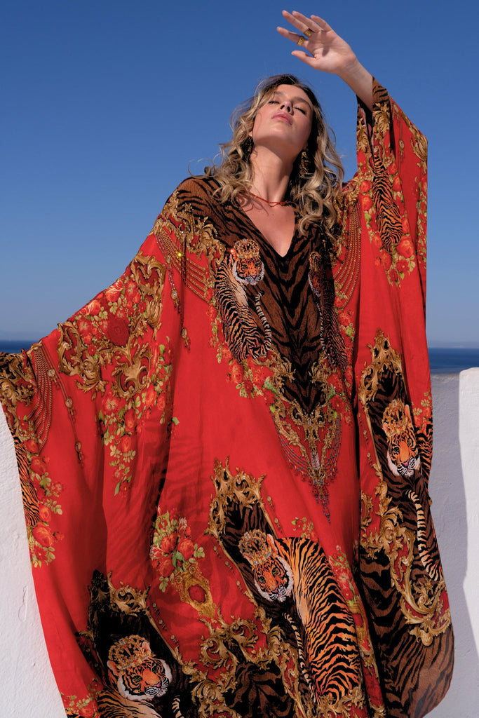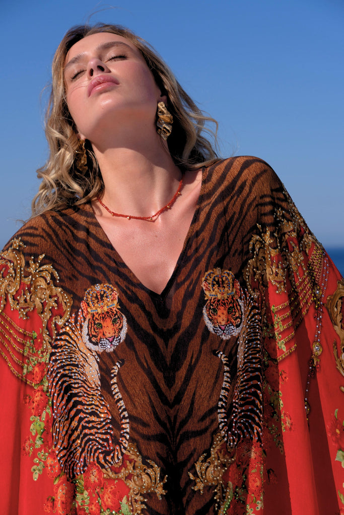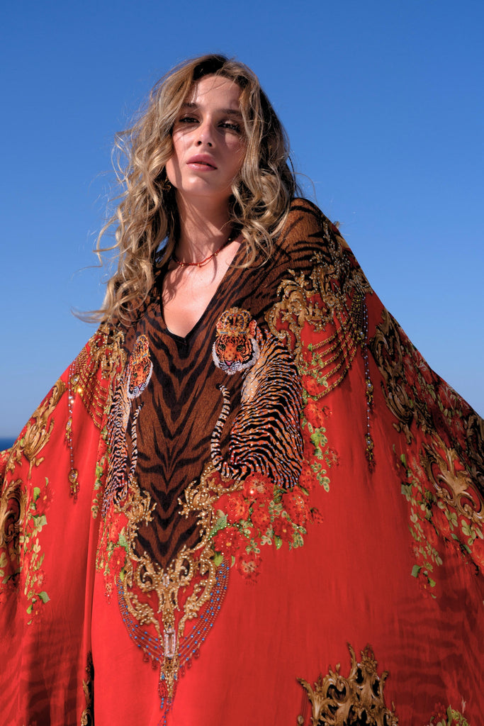 Enhance your collection with the Tales of the Tigress Maxi Kaftan, made from sumptuous viscose silk that flows gracefully in a maxi-length design. This one-size garment features an elegant V-neck and ample width, adorned with hand-applied crystals that shimmer subtly. The vibrant red fabric showcases powerful tiger motifs alongside delicate floral patterns, combining boldness and elegance seamlessly. Ideal for creating a polished and memorable look at any event.
