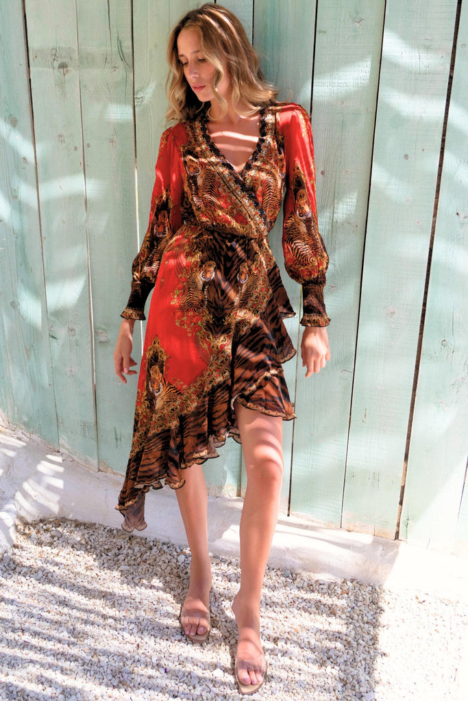 The Tales of the Tigress Hi Low Wrap Dress combines elegance and bold design in luxurious viscose silk. Featuring a sophisticated V-neck and hand-embellished crystals, this midi-length dress offers a flattering silhouette with an adjustable waist drawstring. The shirred cuffs and hi-low hem add refined details, while the vibrant red fabric showcases striking tiger motifs and delicate floral prints, creating a captivating and graceful statement piece.