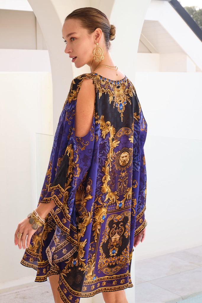 Look and feel like royalty in this Midnight Blue Kaftan Dress! Crafted from luxurious Viscose Silk, it's designed with a shoulder slit and embellished neckline for extra sparkle. The relaxed fit and one-size-fits-all style make it versatile - dress it up with matching palazzo pants and a medium cape for a look fit for the queen of style!