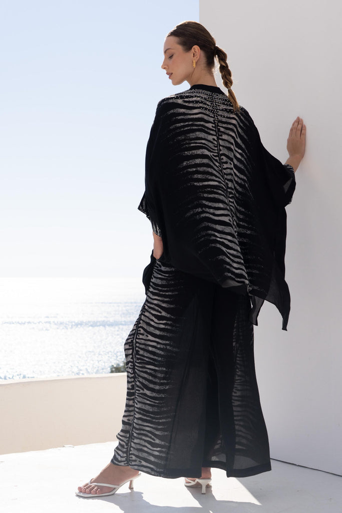 This two piece set features black zebra print is enhanced with hand-embellished crystals, adding a subtle touch of elegance.. The kaftan top has a button down design and cuffed sleeves, while the trousers have an adjustable waist drawstring and convenient side pockets. Made from luxurious viscose silk, this set will have you feeling confident and stylish in any setting.