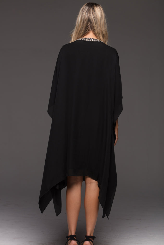 A very stunning short length 100% Silk kaftan hand made with love, It is beautifully sewn with Clear crystals & Swarovski's around the V neckline..