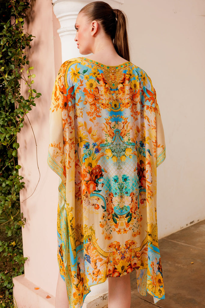 Introduce elegance to your summer wardrobe with our Summer Garden Kaftan Dress. Made from luxurious viscose silk, this one size kaftan features a V neckline and is hand embellished with crystals for a touch of glamour. The pastel colors and floral prints add a romantic touch to this short dress.