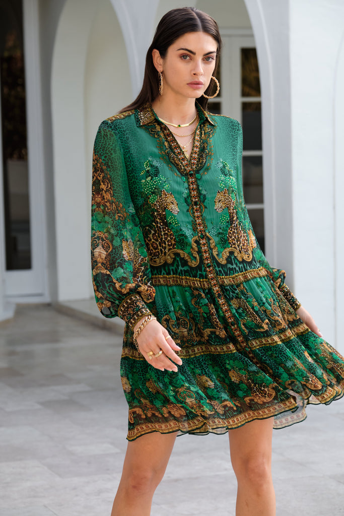 Look chic and feel comfortable in this stunning EMERALD LEOPARDESS SHIRT DRESS. This knee-length dress is lined and boasts a stylish collar, with a chiffon fabric and eye-catching animal print in emerald hues. Its cuffed long sleeves and relaxed fit make it a perfect piece for day-to-night dressing, while a button-up design ensures you'll look polished for any occasion.