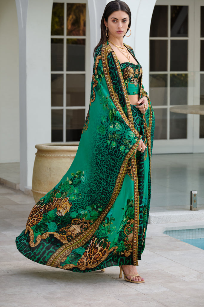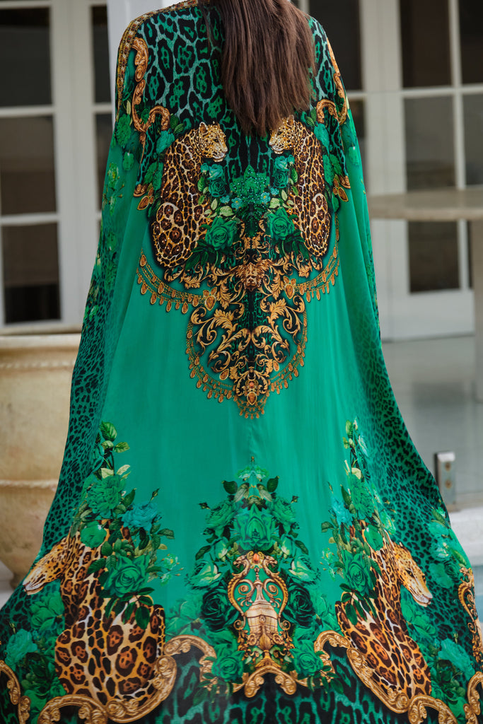 Escape the everyday in this luxurious leopardess long cape. Feel cozy and chic in its emerald hues, enhanced by an eye-catching leopard print. The relaxed fit easily covers up whatever you're wearing, while the embellished viscose silk fabric will keep you comfortable. All that, in one size, for an effortless style!